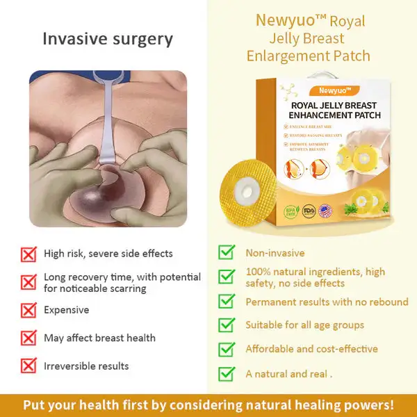 Newyuoยฎย ๐น๐๐๐๐ ๐ฑ๐๐๐๐ ๐ฉ๐๐๐๐๐ ๐ฌ๐๐๐๐๐๐๐๐๐๐ ๐ท๐๐๐๐ย ย differs from traditional estrogen-based breast enhancement products by incorporating natural ingredients that are highly compatible with the human body, such as Royal Jelly, Type 3 peptide protein, and various herbal extracts. These highly active components undergo a concentration process and are fused into a pudding-like breast patch. During use, the breast patch makes close contact with the breast, accelerating the absorption of nutrients by the mammary glands, thereby promoting natural breast growth for enhancement purposes. Additionally, the Royal Jelly contains various growth factors like 10-hydroxy-2-decenoic acid (HDA), which aid in stimulating cell regeneration and repairing damaged breast tissue, thus addressing issues of breast sagging and drooping.