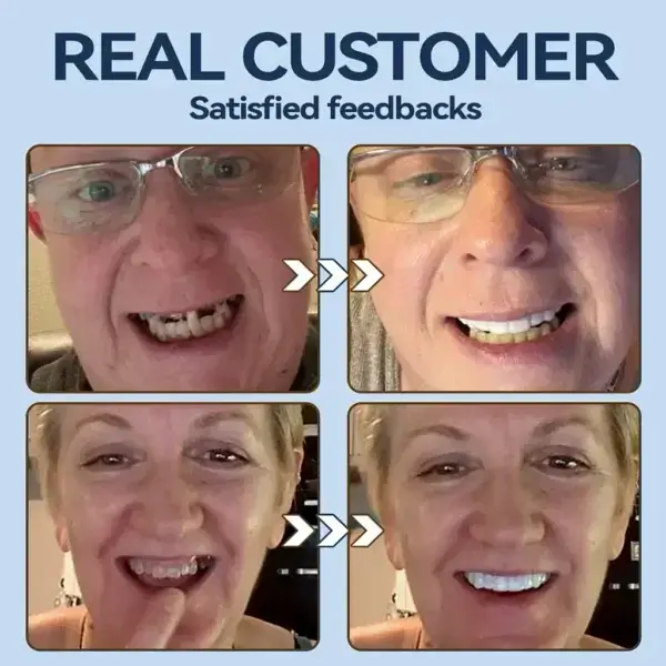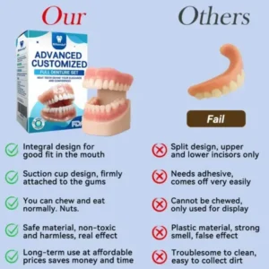 Instant Perfect Smile: Transform your smile instantly with the . Experience the satisfaction of achieving a flawless. customized fit right away. Our innovative denture set eliminates the discomfort of poorly fitting dentures. offering you a snug and natural feel that makes your dentures feel like a true part of your mouth. Say goodbye to sore spots and irritation as Denture Set provides immediate relief. allowing you to enjoy your smile with newfound confidence and comfort. Enjoy a seamless transition to a better-fitting. more comfortable denture experience without delay.