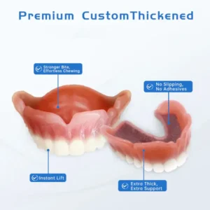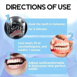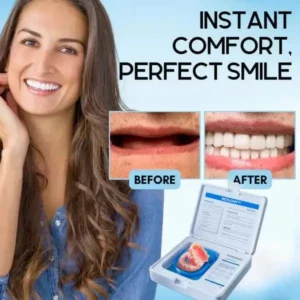 Instant Perfect Smile: Transform your smile instantly with the . Experience the satisfaction of achieving a flawless. customized fit right away. Our innovative denture set eliminates the discomfort of poorly fitting dentures. offering you a snug and natural feel that makes your dentures feel like a true part of your mouth. Say goodbye to sore spots and irritation as Denture Set provides immediate relief. allowing you to enjoy your smile with newfound confidence and comfort. Enjoy a seamless transition to a better-fitting. more comfortable denture experience without delay.