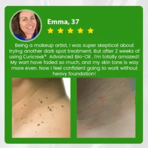 After just one week, the transformation was unbelievable. The skin tag and blemishes I had been so self-conscious about were almost completely gone, and my skin looked clear, radiant, and flawless. I can’t believe how much more confident I feel now! The Curicreek® Advanced Bio-Oil Mole & Spot Corrector has far exceeded my expectations and has become a must-have in my skincare routine.
