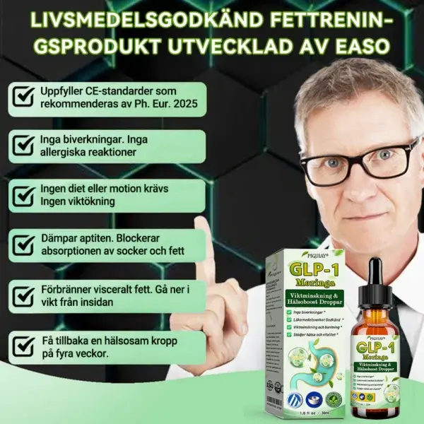 Det är perfekt för alla som behöver ta itu med fetma-relaterade problem och jag rekommenderar det verkligen. En flaska av Piguiay® GLP-1 Moringa Viktminskning & Hälsoboost Droppar ger fler fördelar än 15 dagars kontinuerlig träning. Detta är ett helt nytt genombrott i behandlingen av fetma världen över! — Dr. Eric Westman