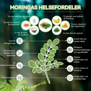 Moringa: Moringa är en naturlig näringsrik kraftkälla som stödjer viktkontroll och allmän hälsa. Den innehåller protein och alla essentiella aminosyror, vilket gör den till en utmärkt växtbaserad proteinkälla. Rik på vitaminerna A, C och E hjälper den att förbättra syn, immunförsvar och kollagenproduktion. Den ger också kalcium, järn och kalium för att stödja ben- och hjärthälsa. Dess antioxidanter minskar inflammation, medan fibrerna hjälper till med matsmältning och blodsockerreglering. Dessutom främjar Moringa produktionen av GLP-1, vilket hjälper till att dämpa hungern och stödja viktkontroll.