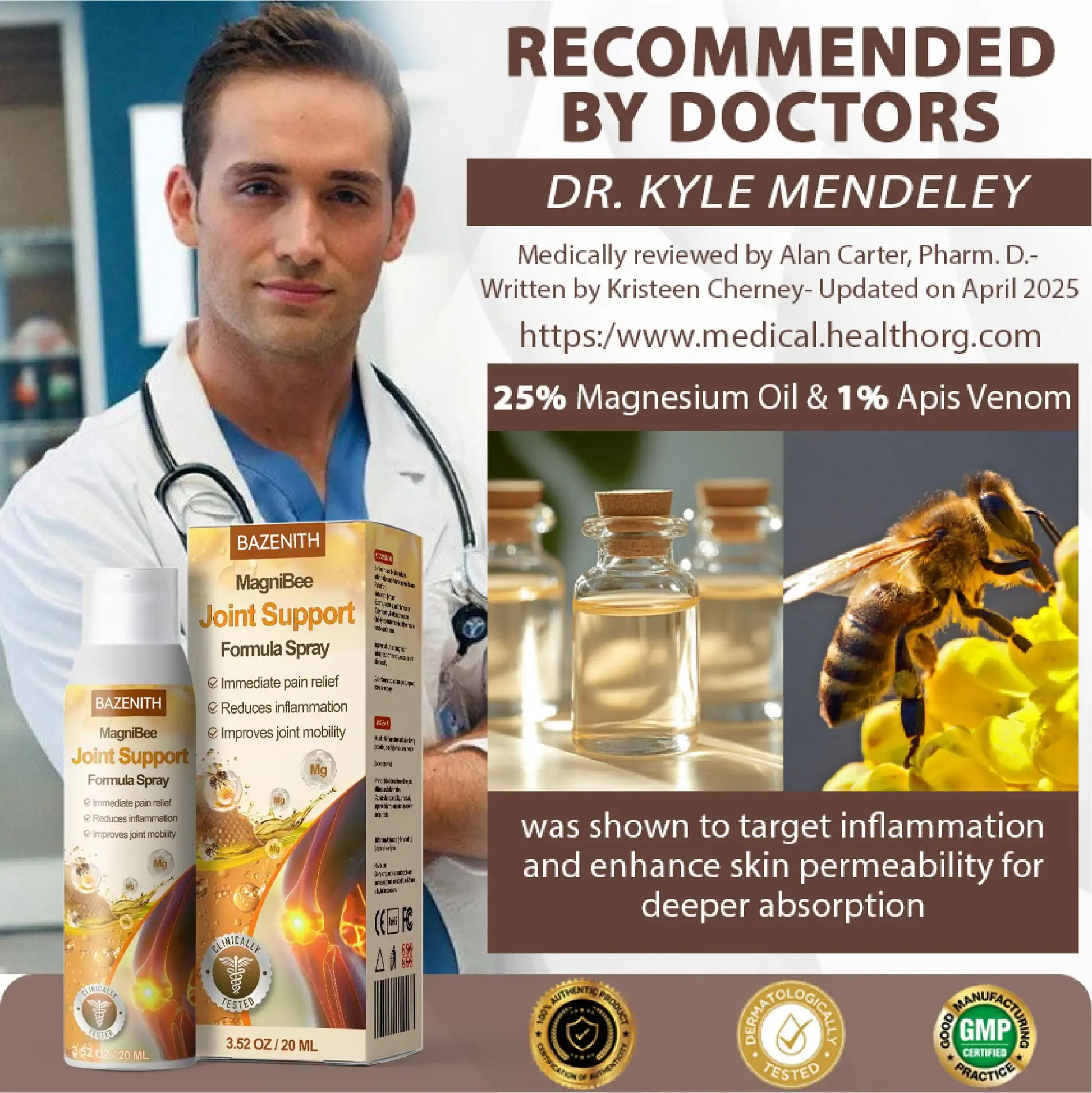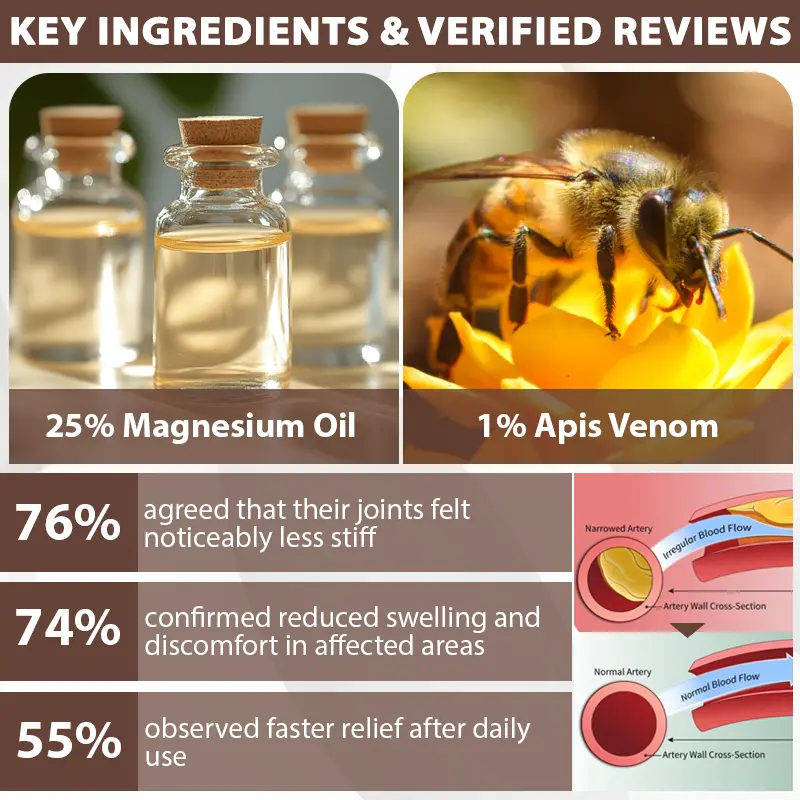 Certified and trusted by Dr. Kyle Mendeley, January 23, 2025, Bazenith™ MagniBee Joint Support Formula Spray has shown promising results in improving joint comfort and flexibility. This formula contains 25% magnesium oil, which helps relax muscles, ease stiffness, and support joint mobility through enhanced mineral absorption.