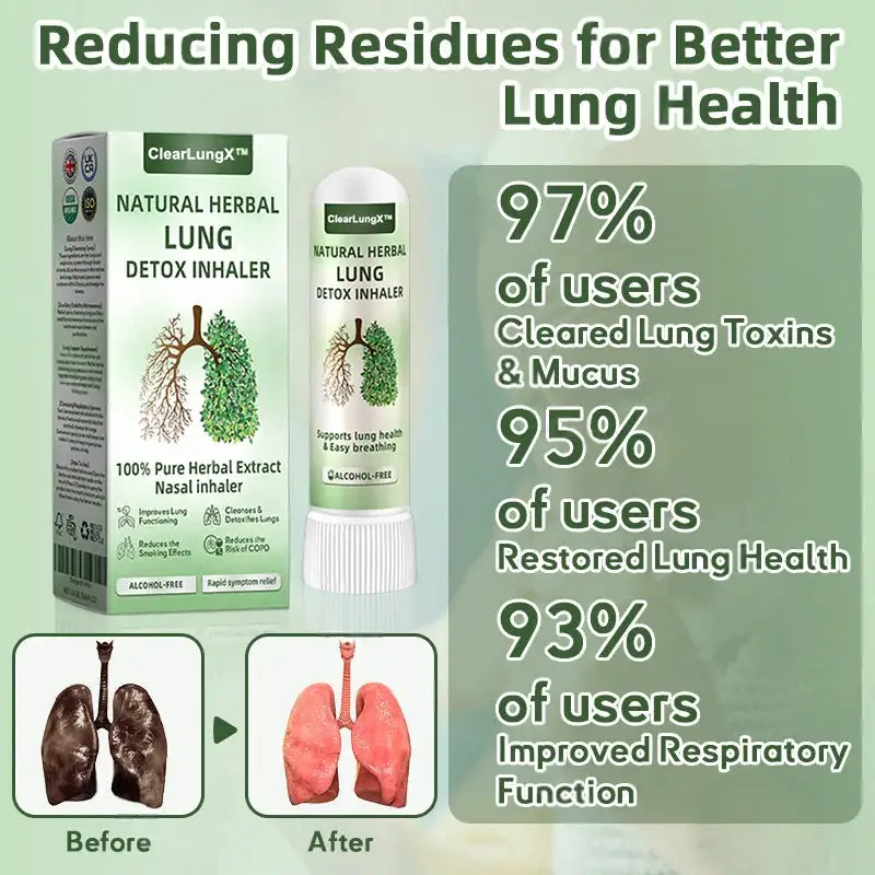 The ClearLungX™ Natural Herbal Lung Detox Inhaler is recommended by leading lung experts and is designed to thoroughly eliminate lung mucus and repair damaged lung tissue, effectively alleviating various respiratory conditions such as chronic obstructive pulmonary disease (COPD), asthma, and chronic cough.