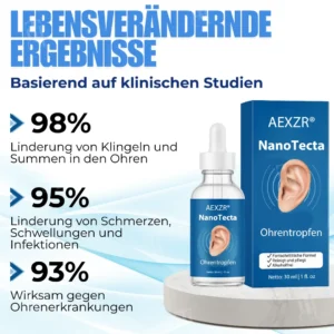 A: Die meisten Ohrentropfen enthalten synthetische Chemikalien oder generische Inhaltsstoffe, die die Symptome nur vorübergehend überdecken. NanoTecta enthält drei exklusive Bifidobakterienstämme (B. longum AE-3, B. bifidum NT-7 und B. lactis CR-12), die es sonst nirgendwo auf der Welt gibt. Diese Stämme stellen das natürliche bakterielle Gleichgewicht Ihres Ohrs wieder her und bekämpfen die Ursache von Tinnitus – die “stille Entzündung” in Ihrem Gehör. Die proprietäre Nano-Verabreichungstechnologie stellt sicher, dass diese nützlichen Bakterien tief in Ihren Gehörgang gelangen, wo herkömmliche Tropfen nicht eindringen können.