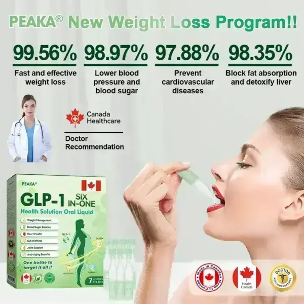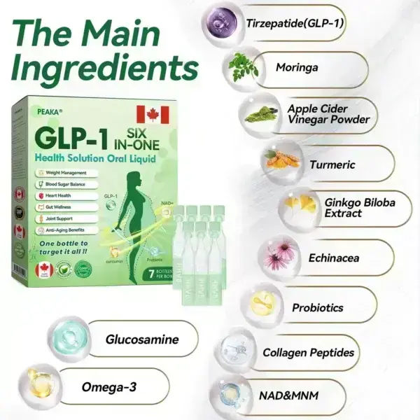 Peaka® GLP‑1 SIX‑IN‑ONE Health Solution Oral Liquid is a clinically endorsed, GMP‑certified, Health Canada (HC)-approved daily oral supplement combining GLP‑1 (Tirzepatide), NAD+, and botanical elements like moringa, turmeric, and apple cider vinegar. Created by international specialists in endocrinology and diabetology, it’s a safe, science-based solution for weight loss, metabolic support, blood sugar control, and overall wellness.