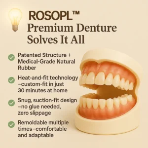 ROSOPL™ Premium Denture offers a custom-fit, adhesive-free solution that restores your natural smile, supports facial structure, and boosts confidence—all from the comfort of your home.