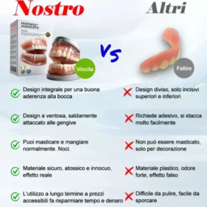 Sorriso perfetto istantaneo: trasforma il tuo sorriso all’istante con il set. Prova la soddisfazione di ottenere subito una protesi perfetta e personalizzata. Il nostro innovativo set di protesi elimina il fastidio di protesi inadatte, offrendoti una sensazione di comfort e comfort che rende la tua protesi parte integrante della tua bocca. Di’ addio a irritazioni e punti dolenti: il set di protesi offre un sollievo immediato, permettendoti di goderti il tuo sorriso con ritrovata sicurezza e comfort. Goditi una transizione fluida verso una protesi più adatta e confortevole, senza indugi.