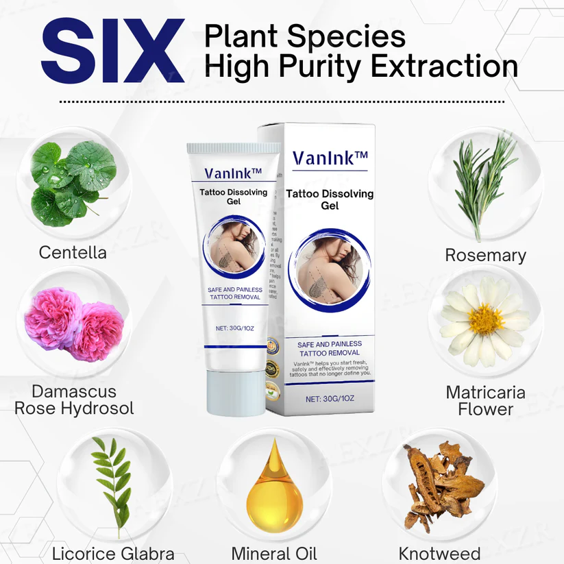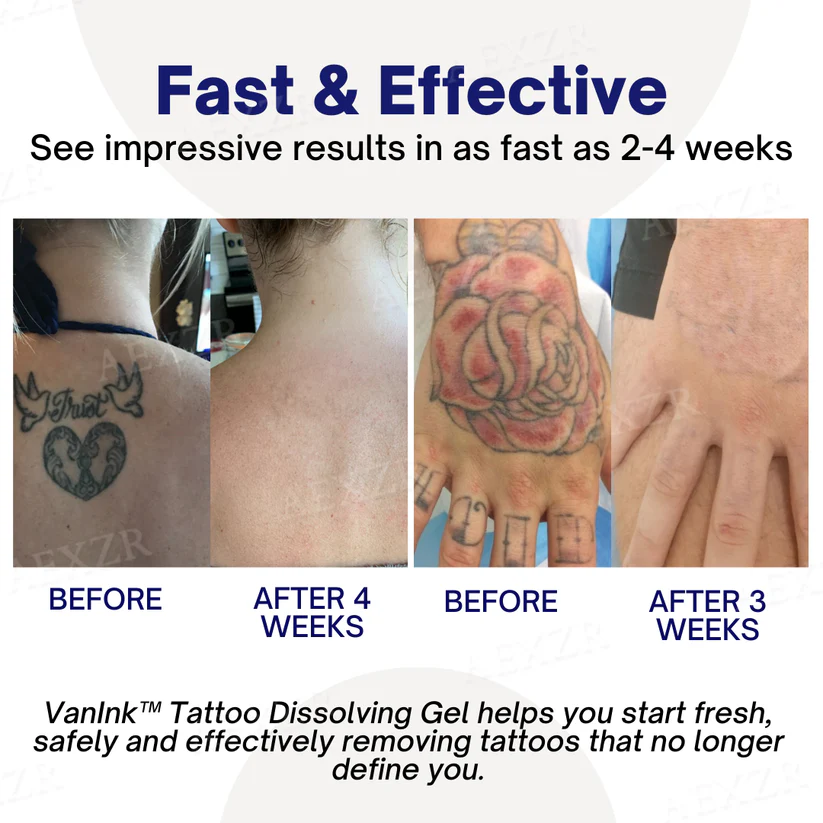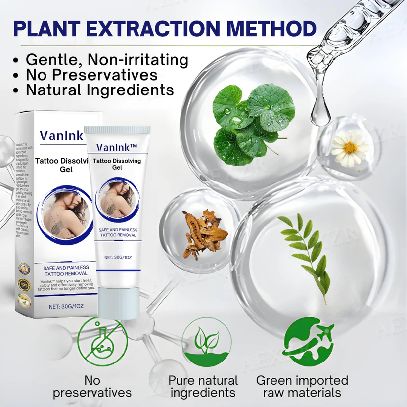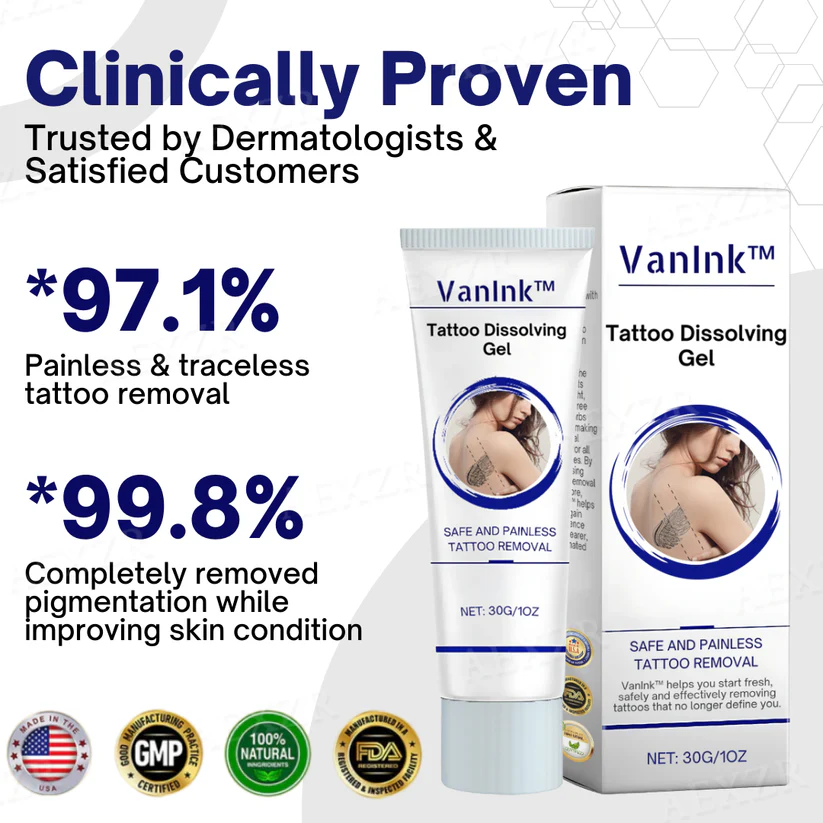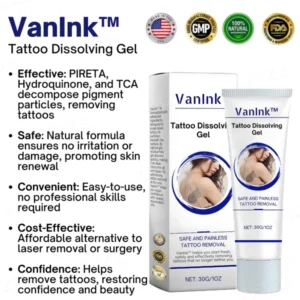 VanInk™ Tattoo Dissolving Gel provides a breakthrough, non-invasive solution for those seeking to remove tattoos without the risks, pain, or high costs of traditional methods. With its clinically proven formula and safe ingredients, VanInk™ ensures that you can achieve clear, tattoo-free skin with ease. Try it today and experience the gentle power of VanInk™!
