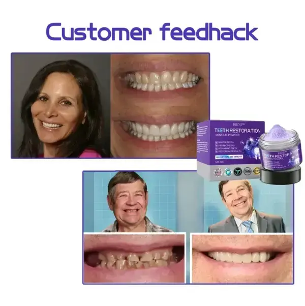 BBOJI™ Teeth Restoration Mineral Powder eliminates 99.99% of bacteria, resolves bad breath, removes plaque and tartar, treats gingivitis and periodontitis, relieves toothache, prevents and treats cavities, restores tooth enamel, stimulates reparative dentin formation, and supports the regeneration of lost teeth.