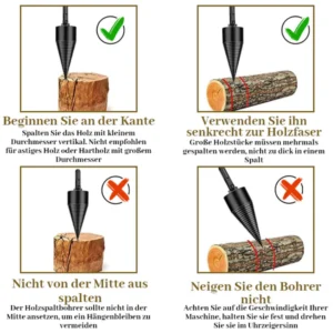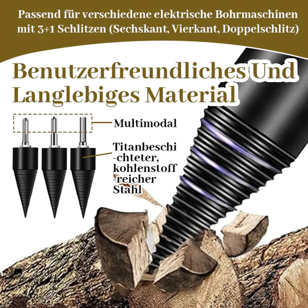 • Konischer Bohrer: Tiefe Gewinde für schnelleres Spalten, ideal um große Blöcke in Anzündholz zu verwandeln.